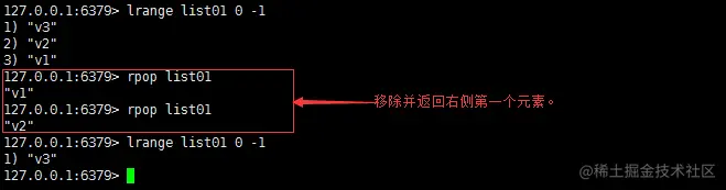 功能:移除并返回列表key尾部第一个元素,即列表右侧的第一个元素。