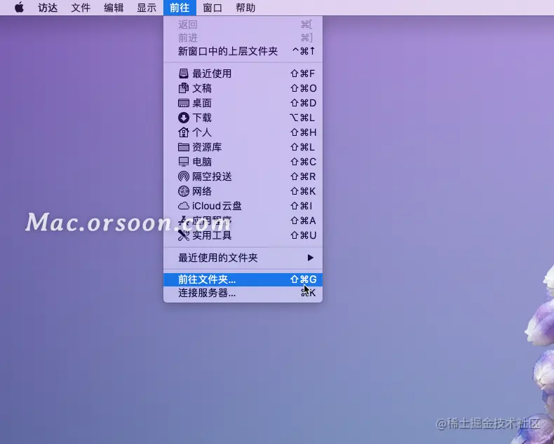 2.前往 Finder,下拉“前往”菜单,选择“前往文件夹...”并输入以下路径: