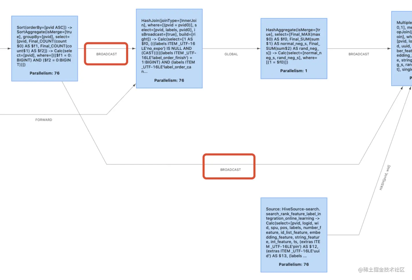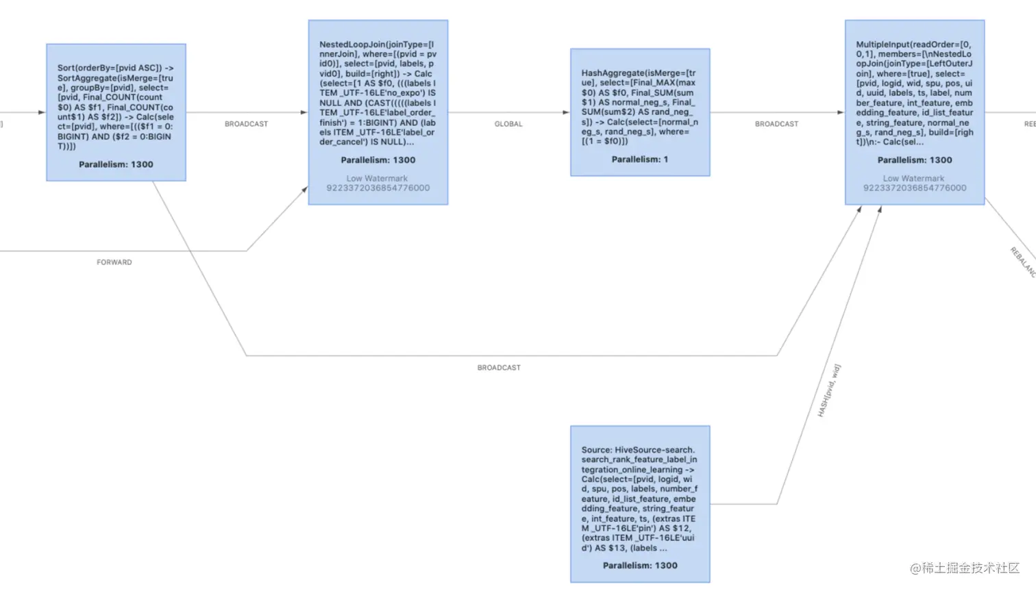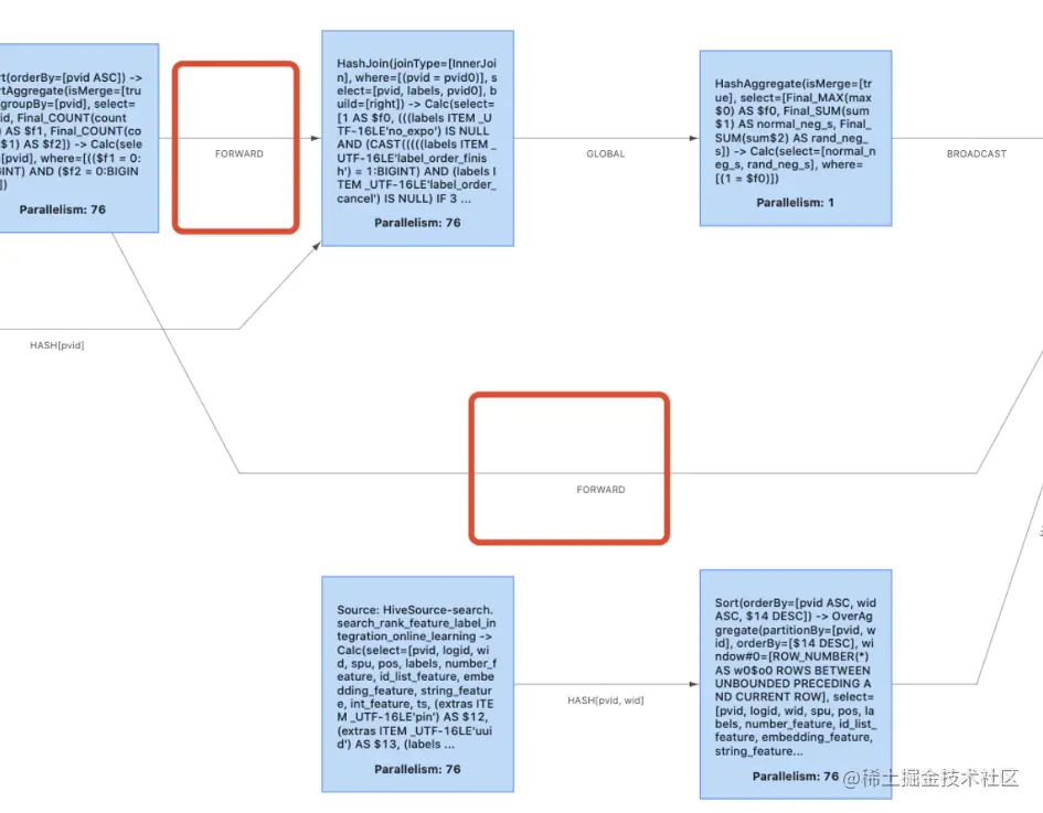 - Nested-loop Join 最为简单直接,将两个数据集加载到内存,并用内嵌遍历的方式来逐个比较两个数据集内的元素是否符合 Join 条件。Nested-loop Join 的时间效率以及空间效率都是最低的,可以使用:table.exec.disabled-operators:NestedLoopJoin 来禁用。以下两张图片是禁用前和禁用后的效果 (如果你的禁用没有生效,先看一下是不是 Equi-Join):