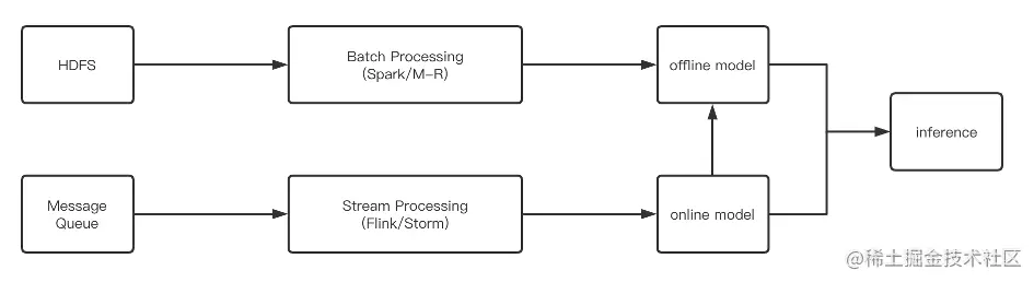 目前,京东搜索推荐的数据处理流程如上图所示。可以看到实时和离线是分开的,离线数据处理大部分用的是 Hive / Spark,实时数据处理则大部分用 Flink / Storm。