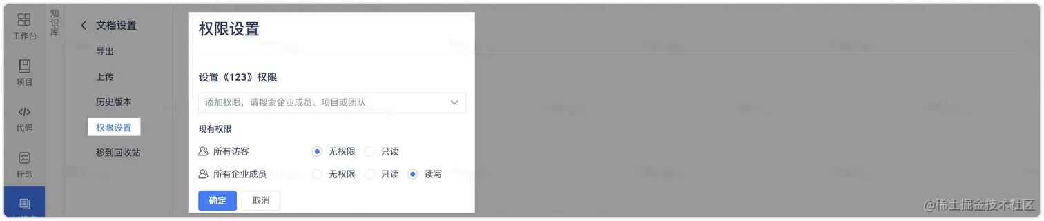 注:仓库 wiki 的权限与仓库权限相关,不支持在知识库下设置权限。