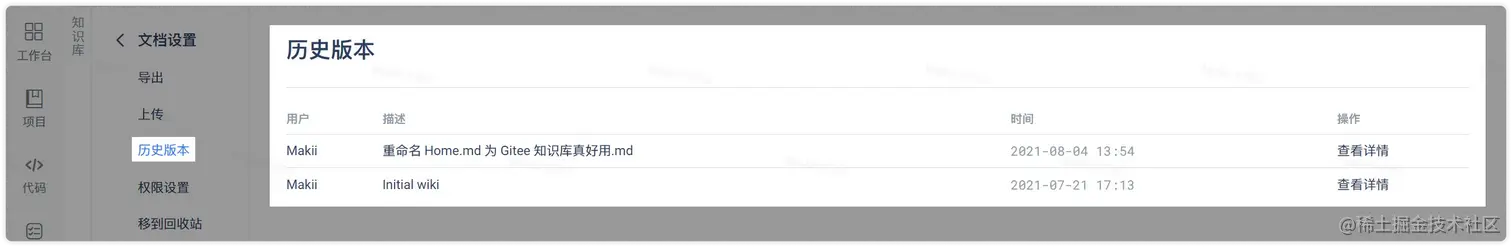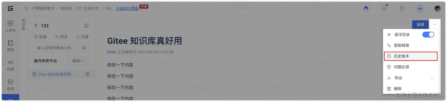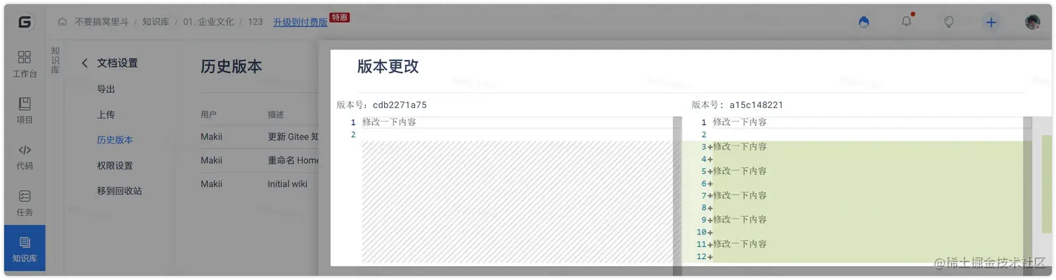 支持。Gitee 知识库采用了独特的“异步协同”机制,用户可以用过查看“历史版本”找到所有编辑内容,无需担心数据丢失问题。