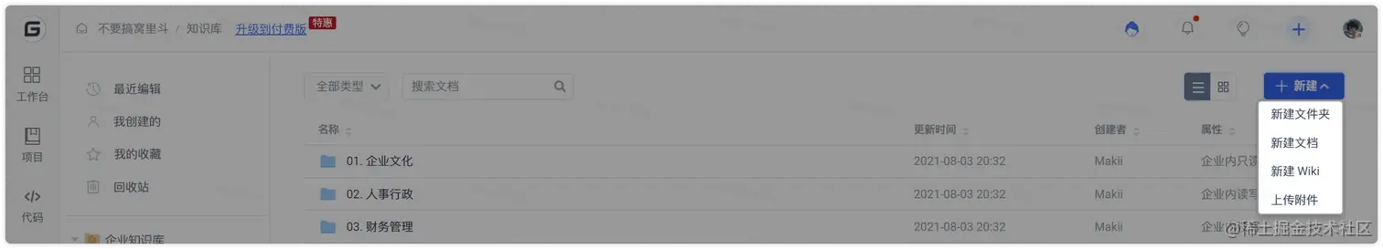- 方式一:在知识库顶部点击“新建”按钮,并选择“新建文件夹/文档/上传附件”,即可在当前文件夹下新建一个对应的文件