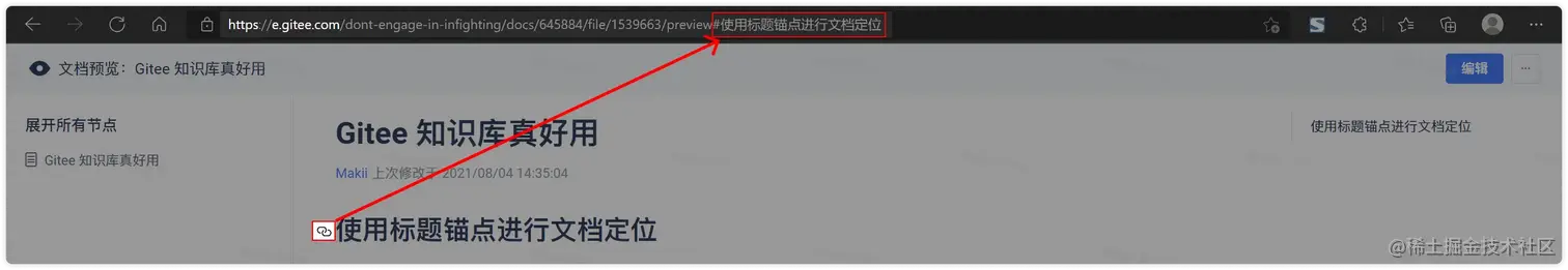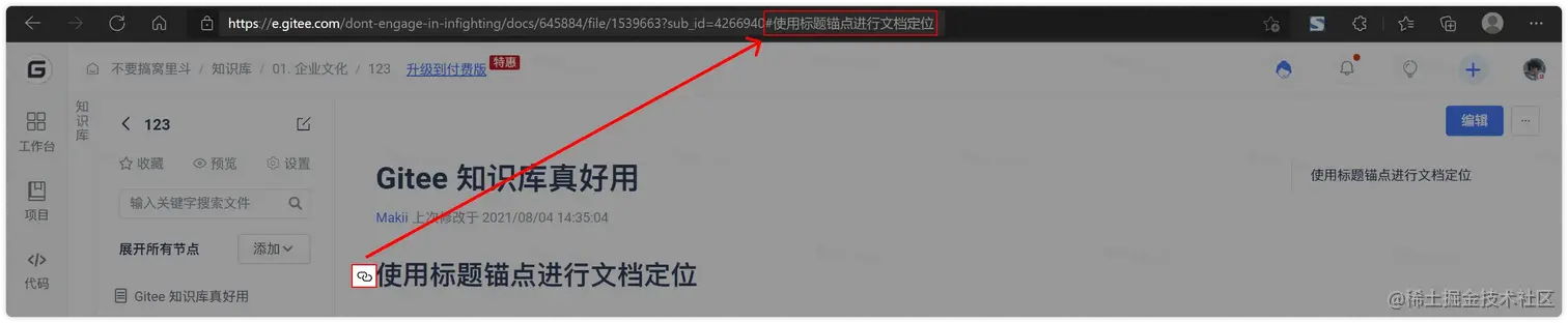 - 将鼠标悬浮在内容中的“标题”上,点击出现在左侧的“锚点”按钮,即可将文档位置定位在链接中