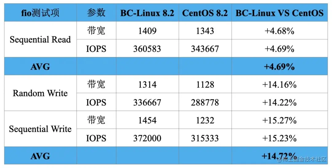 - IO性能增强:根据fio测试结果,BC-Linux V8.2相比CentOS 8.2在随机写性能方面增强**15%左右,顺序读性能增强4%**左右;