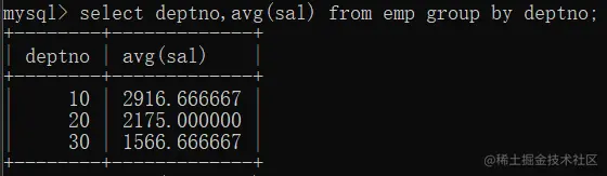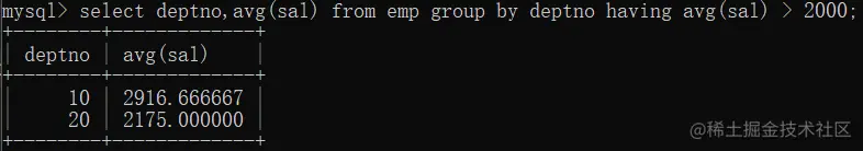 select deptno,avg(sal) from emp where avg(sal) > 2000 group by deptno; // 错误