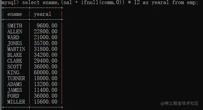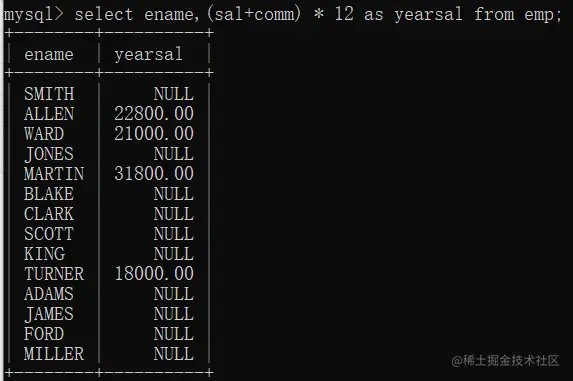 select ename,(sal + ifnull(comm,0)) * 12 as yearsal from emp; // 正确写法
