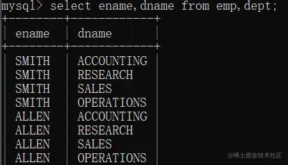 笛卡尔积现象 : 当两张表进行连接查询的时候,没有任何条件的限制,最终的查询结果条数是两张表记录条数的乘积。