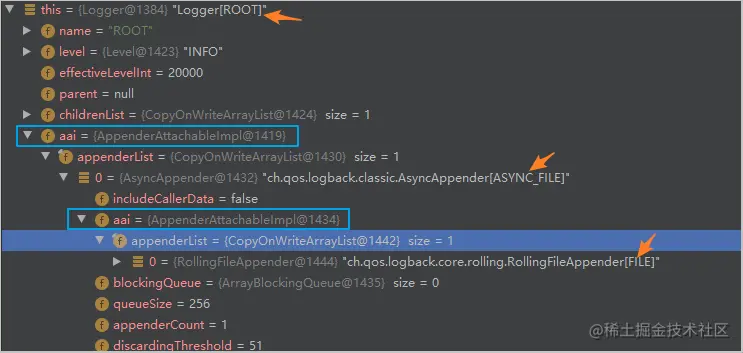 根据上面的 xml 配置,解析得到的 root logger 如下图所示: