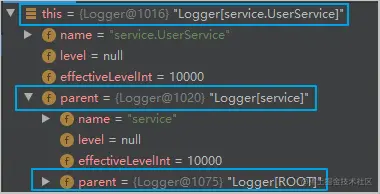 我们来看这个循环 for (Logger l = this; l != null; l = l.parent) { },这里从当前 Logger 向上查找父 Logger,拿 service.userService 举例来说: