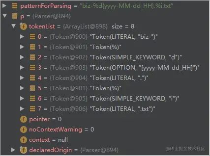 如图所示,logback 中自制的分词器将 biz-%d{yyyy-MM-dd_HH}.%i.txt 解析成了 tokenList。