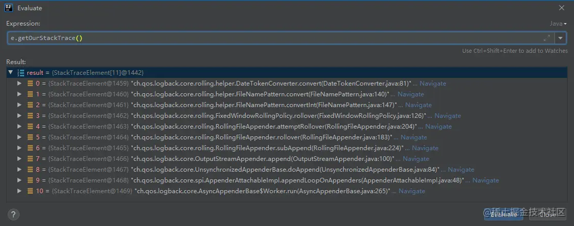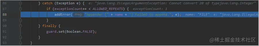 断点可以设置在 rollover 这个方法所在行。接下来,当文件大小超过指定大小,调用 rollback 时出现了异常,这个异常被 ch.qos.logback.core.UnsynchronizedAppenderBase 的 doAppend 方法捕获了: