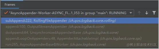 现在,我们把断点放在 ch.qos.logback.core.rolling.RollingFileAppender 的 222 行,看一下 subAppend 的执行: