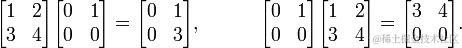 值得一提的是,矩阵乘法满足结合律和分配率,但并不满足交换律,如下图所示的这个例子,两个矩阵交换相乘后,结果变了: