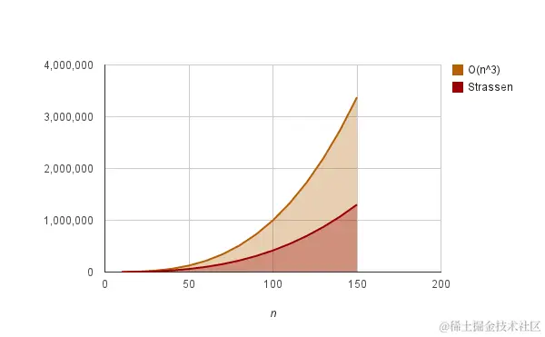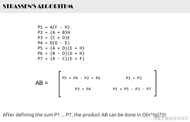 表面上看,Strassen算法仅仅比通用矩阵相乘算法好一点,因为通用矩阵相乘算法时间复杂度是,而Strassen算法复杂度只是