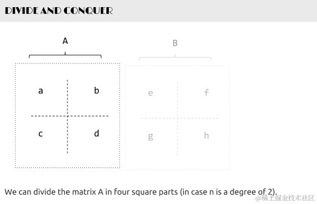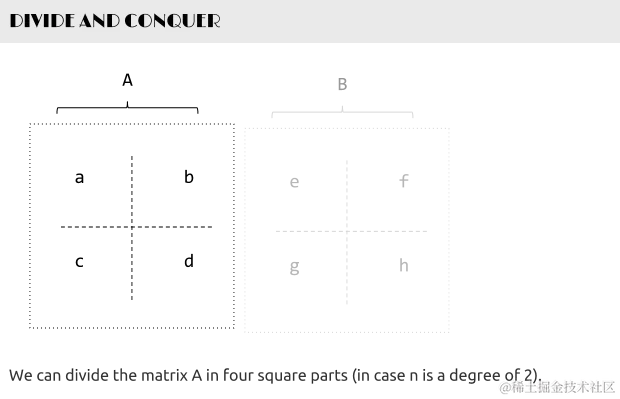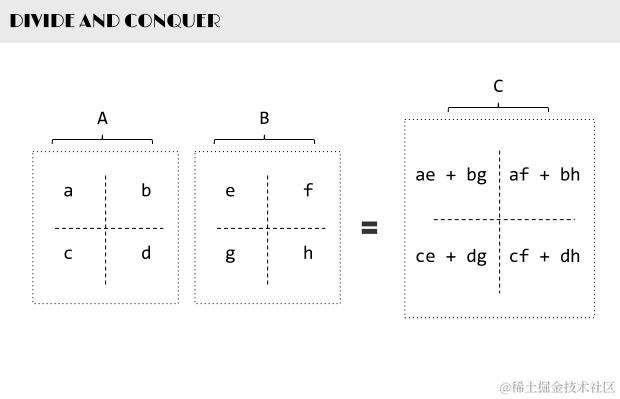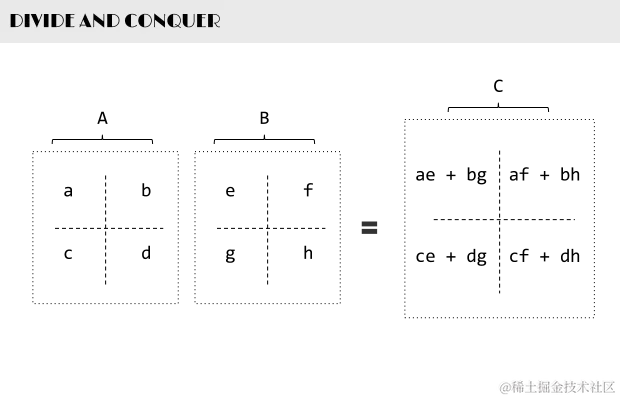 一般说来,当数据量一大时,我们往往会把大的数据分割成小的数据,各个分别处理。遵此思路,如果丢给我们一个很大的两个矩阵呢,是否可以考虑分治的方法循序渐进处理各个小矩阵的相乘,因为我们知道一个矩阵是可以分成更多小的矩阵的。