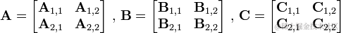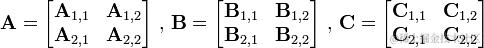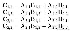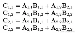 - 两个矩阵A B相乘时,将A, B, C分成相等大小的方块矩阵: