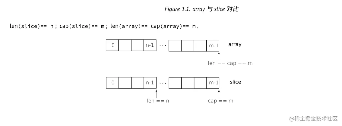slice 总是与一个固定长度的 array 成对出现。其影响 slice 的容量和长度