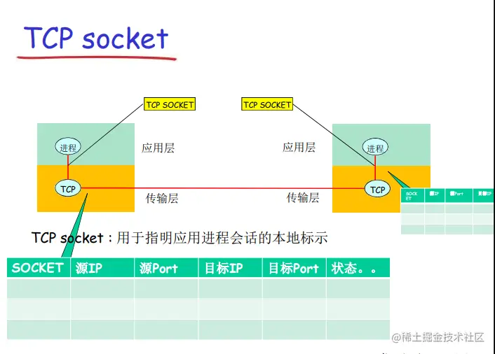 所以说, tcp socket 就是一个本地的标识。它代表了左侧的 IP、 TCP 端口上面的应用进程和右侧的 IP、 TCP 端口上的这个应用进程之间的通讯关系。