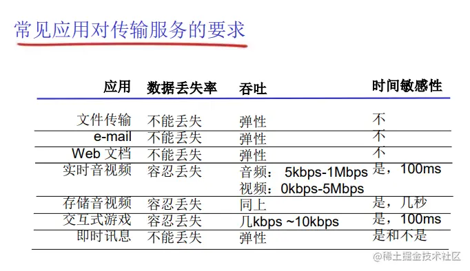 - 一些应用出于有效性考虑,数据传输有严格的时间限制,比如说 Internet 电话、交互式游戏。