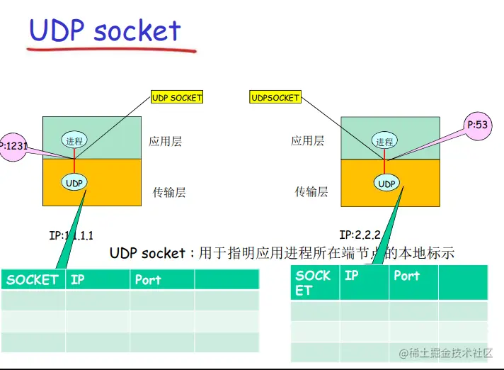 对于使用无连接服务(UDP)的应用而言,套接字是2元组的一个具有本地意义的标示:IP、port。用这个套接字,指定应用所在的一个端节点。