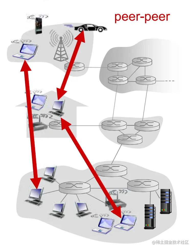 首先发起通信的这个进程,叫客户端。进行响应客户端的这种请求,叫服务器。注意:P2P 架构的应用也有客户端进程和服务器进程之分哦,每个 Peer 既可以是客户端,也可以是服务器。