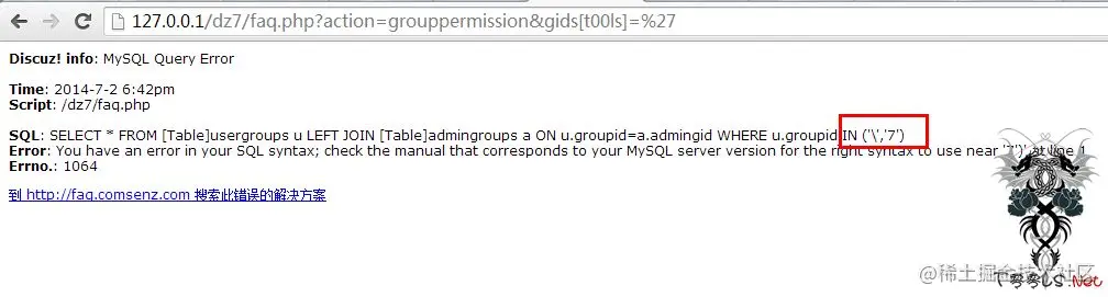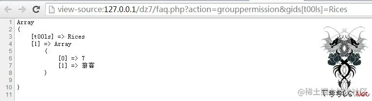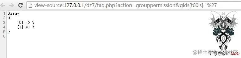 这里Discuz只考虑到了自己程序的取值, 因为gids原始形成的就是一个多维数组, 但是既然我们可控的话, 漏洞在这里就产生了 看我们最开始说的, 这种取值方法如果目标非Array的话, 那么单引号就没有了~ 我们来测试下 传递 1.php?gids\[t00ls\]=%27 然后我们直接print_r处理后的groupids~
