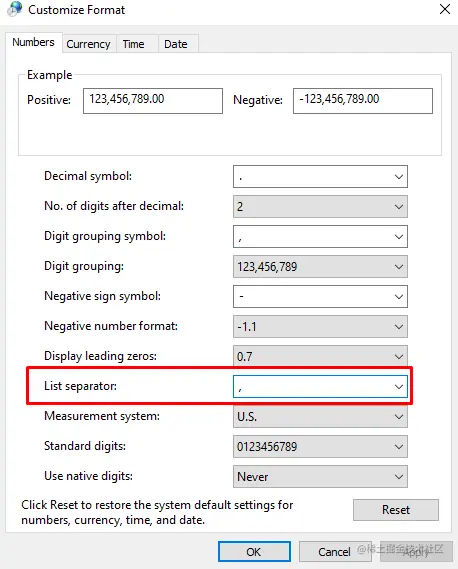 5.接下来,按照这个图片使你的电脑使用美国格式,或者如果你不想要它,只需将'列表分隔符'从分号改为逗号即可