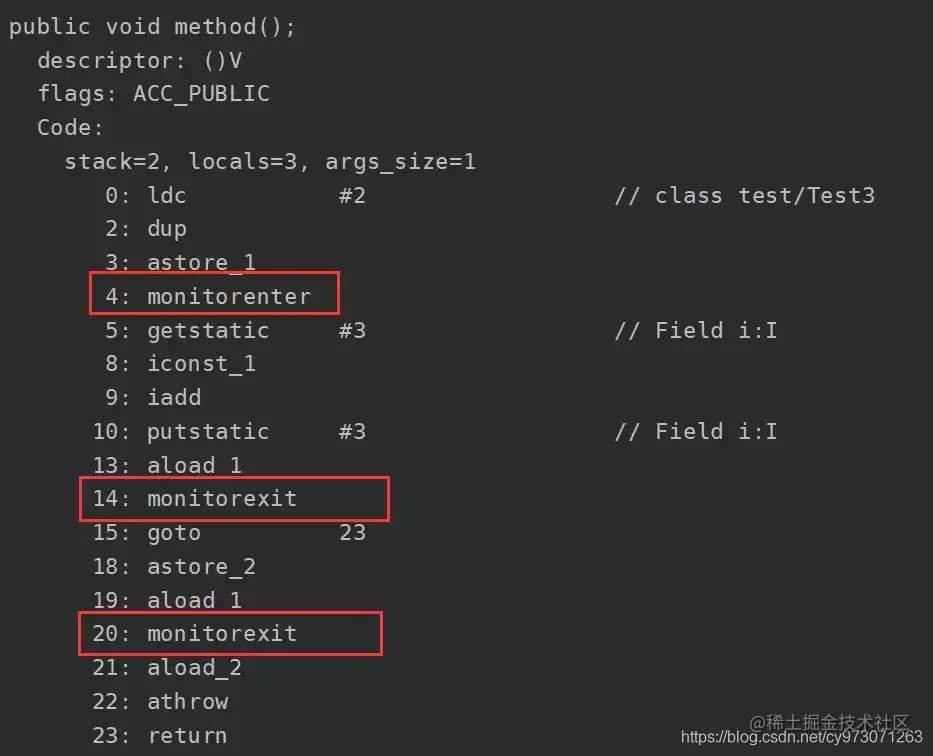 但是为什么会有两个monitorexit呢?其实第二个monitorexit是来处理异常的,仔细看反编译的字节码,正常情况下第一个monitorexit之后会执行goto指令,而该指令转向的就是23行的return,也就是说正常情况下只会执行第一个monitorexit释放锁,然后返回。而如果在执行中发生了异常,第二个monitorexit就起作用了,它是由编译器自动生成的,在发生异常时处理异常然后释放掉锁 在 Java 中,每个对象都会有一个 monitor 对象(监视器)。