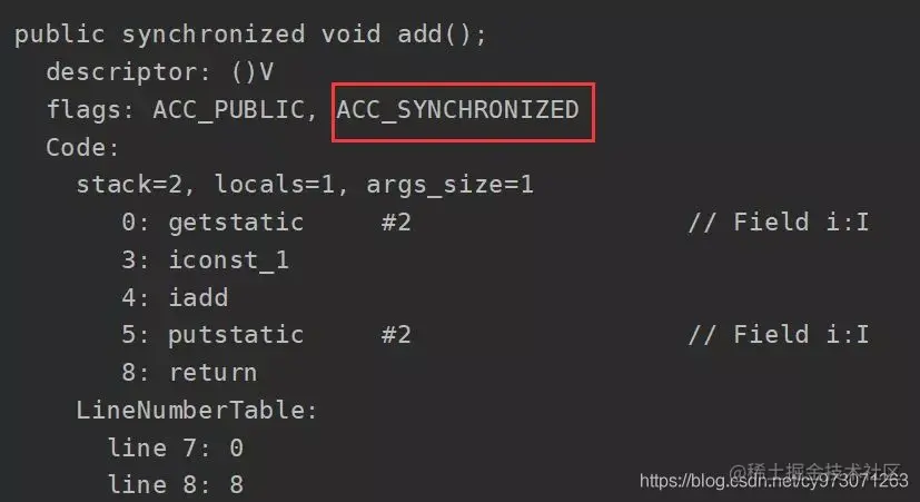 可以看到在add方法的flags里面多了一个ACC_SYNCHRONIZED标志,这标志用来告诉JVM这是一个同步方法,在进入该方法之前先获取相应的锁,锁的计数器加1,方法结束后计数器-1,如果获取失败就线程就会进入阻塞(BLOCK) 状态,直到该锁被释放,当锁的计数器为0时,线程就会释放该锁。