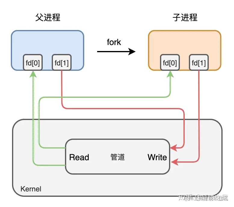 这俩盯着手册上的两个图研究了半天,总算弄明白了,所谓匿名管道不过是内核中的一段缓冲区,提供了读写两个口子,通过fork创建子进程后,子进程继承了父进程的管道信息,两边只要约定好,一个读,一个写,就能实现通信了。