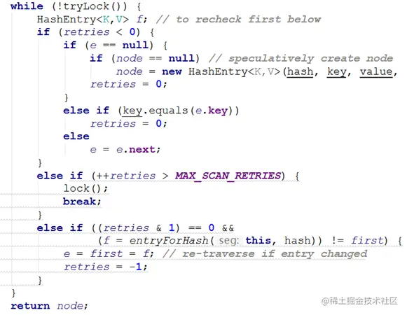 scanAndLockForPut方法里在尝试获得锁的过程中会对对应hashcode的链表进行遍历,如果遍历完毕仍然找不到与key相同的HashEntry节点,则为后续的put操作提前创建一个HashEntry。当tryLock一定次数后仍无法获得锁,则通过lock申请锁。