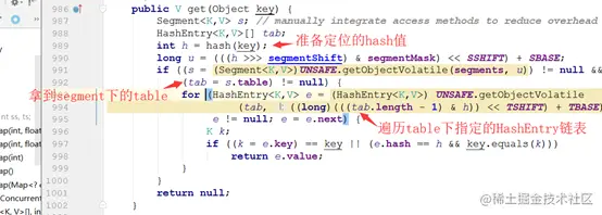get操作先经过一次再散列,然后使用这个散列值通过散列运算定位到Segment(使用了散列值的高位部分),再通过散列算法定位到table(使用了散列值的全部)。整个get过程,没有加锁,而是通过volatile保证get总是可以拿到最新值。