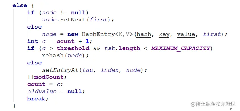否则新建一个HashEntry节点,采用头插法,将它设置为链表的新head节点并将原头节点设为新head的下一个节点。新建过程中如果节点总数(含新建的HashEntry)超过threshold,则调用rehash()方法对Segment进行扩容,最后将新建HashEntry写入到数组中。