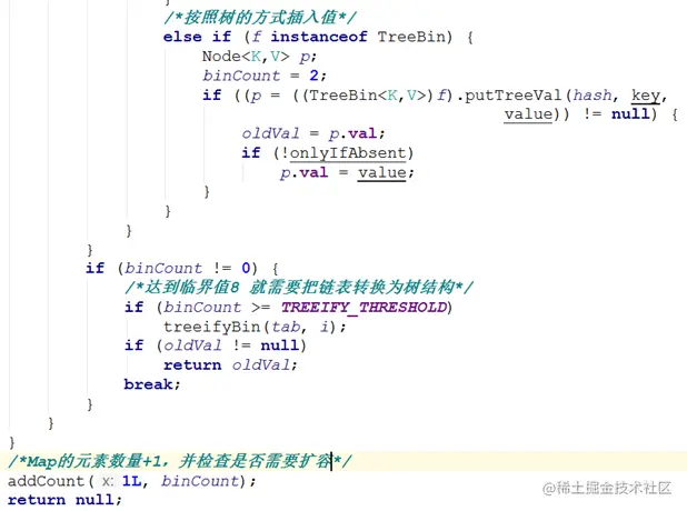如果这个位置存在结点,说明发生了hash碰撞,首先判断这个节点的类型。如果是链表节点,则得到的结点就是hash值相同的节点组成的链表的头节点。需要依次向后遍历确定这个新加入的值所在位置。如果遇到hash值与key值都与新加入节点是一致的情况,则只需要更新value值即可。否则依次向后遍历,直到链表尾插入这个结点。如果加入这个节点以后链表长度大于8,就把这个链表转换成红黑树。如果这个节点的类型已经是树节点的话,直接调用树节点的插入方法进行插入新的值。