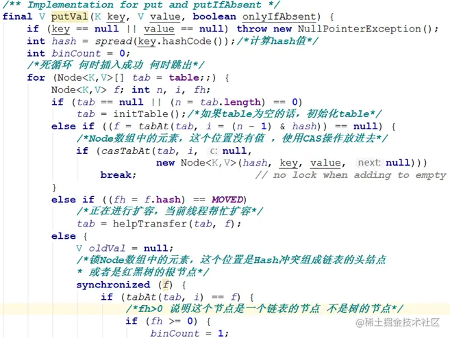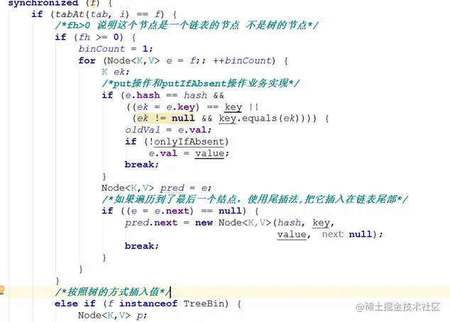 总结来说,put方法就是,沿用HashMap的put方法的思想,根据hash值计算这个新插入的点在table中的位置i,如果i位置是空的,直接放进去,否则进行判断,如果i位置是树节点,按照树的方式插入新的节点,否则把i插入到链表的末尾。
