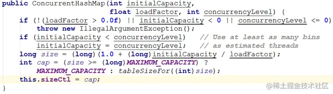 输入参数initialCapacity是ConcurrentHashMap的初始化容量,loadfactor是每个segment的负载因子,在构造方法里需要通过这两个参数来初始化数组中的每个segment。上面代码中的变量cap就是segment里HashEntry数组的长度,它等于initialCapacity除以ssize的倍数c,如果c大于1,就会取大于等于c的2的N次方值,所以segment里HashEntry数组的长度不是1,就是2的N次方。