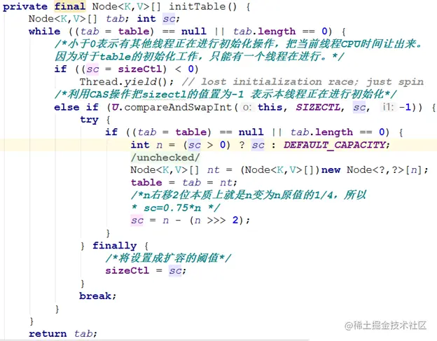 前面说过,构造方法中并没有真正初始化,真正的初始化在放在了是在向ConcurrentHashMap中插入元素的时候发生的。具体实现的方法就是initTable