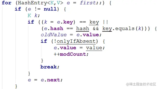 在获得锁之后,Segment对链表进行遍历,如果某个HashEntry节点具有相同的key,则更新该HashEntry的value值,