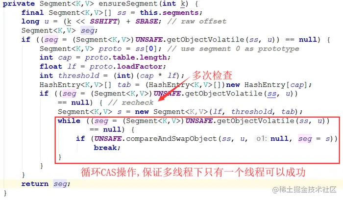 ensureSegment方法考虑了并发情况,多个线程同时进入初始化同一个槽 segment[k],但只要有一个成功就可以了。