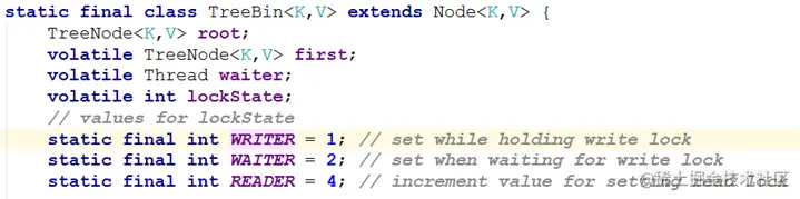 负责TreeNode节点。它代替了TreeNode的根节点,也就是说在实际的ConcurrentHashMap“数组”中,存放的是TreeBin对象,而不是TreeNode对象。另外这个类还带有了读写锁机制。