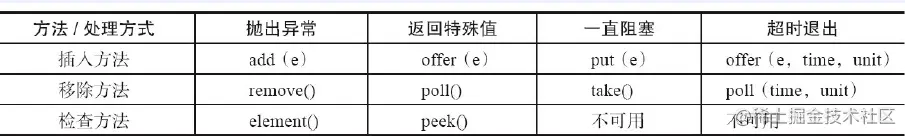 ·抛出异常:当队列满时,如果再往队列里插入元素,会抛出IllegalStateException("Queuefull")异常。当队列空时,从队列里获取元素会抛出NoSuchElementException异常。