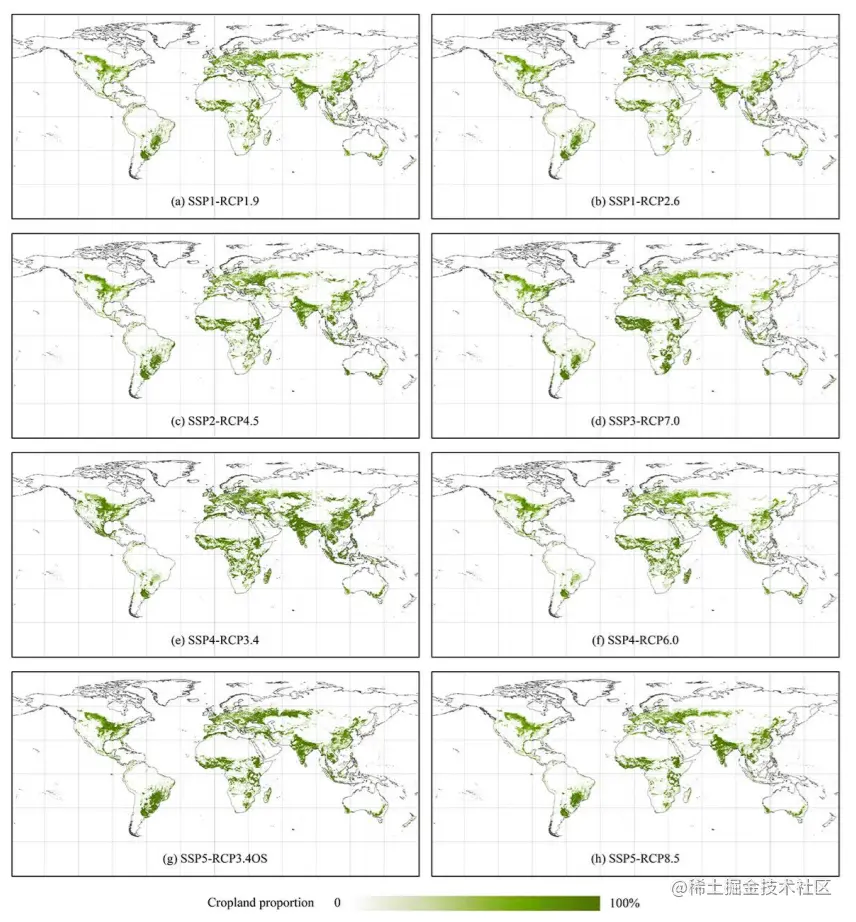 针对还未到来的2100年,作者是通过the History Database of the Global Environment 3.2和the Land-Use Harmonization 2的历史数据集中提取相关参数,然后根据耕地适宜性、核心密度和其他约束条件的组合进行耕地制图。根据未来世界发展方向不同,耕地在2010年到2100年之间,增长率从18.6%到82.4%也不同。不同地理区域之间存在很大的地区差异。但该制图结果在分布格局和总量上与目前广泛使用的数据集吻合较好。
