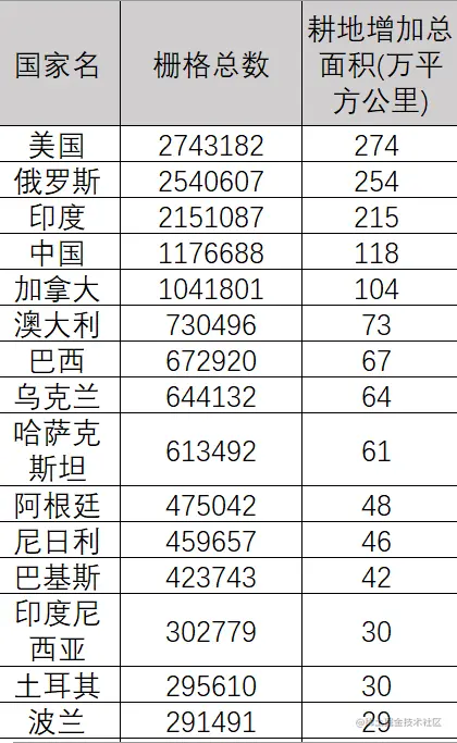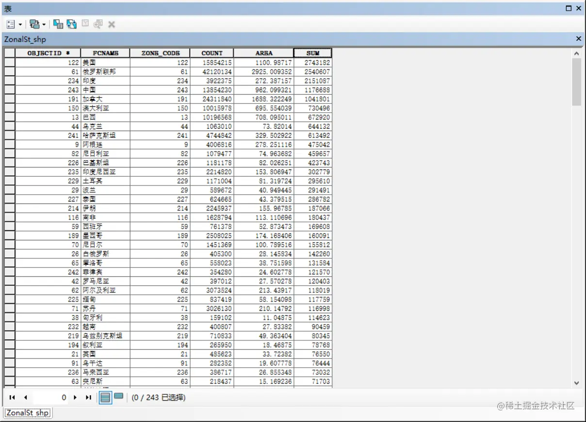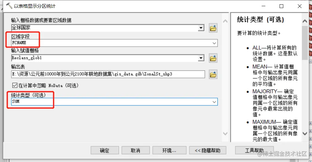 区域字段选择国家名,统计类型一定要设置为SUM。由于新增耕地的栅格值命为1,那SUM代表增加的耕地总栅格数,新增耕地总面积=SUM*单元栅格面积(1平方公里)。