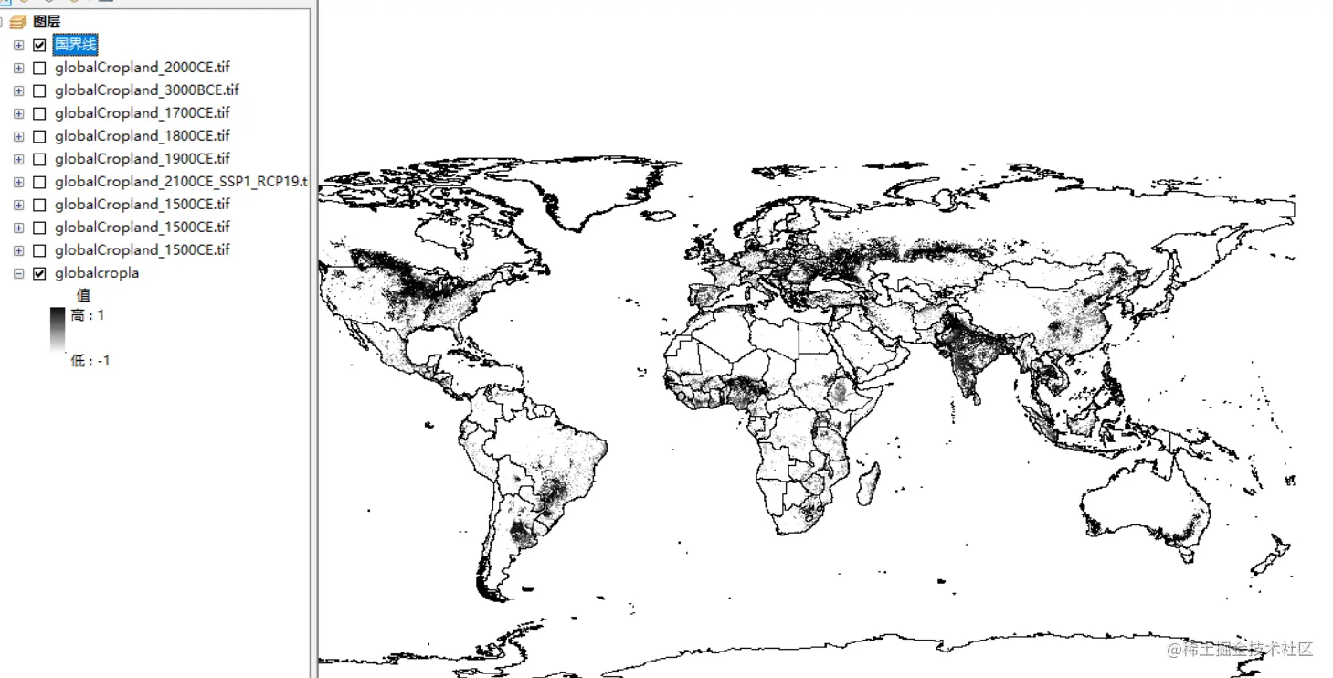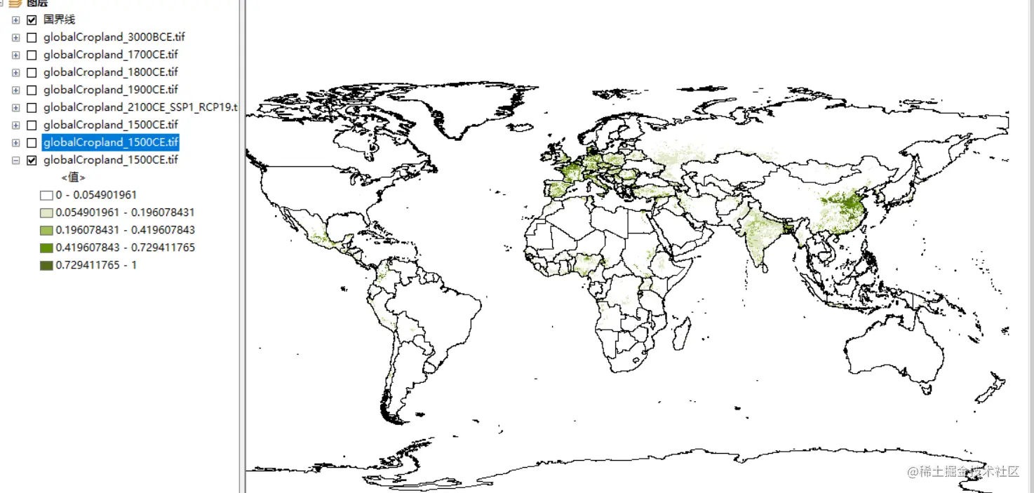 我加载了公元1500年的耕地影像,看起来还不错,符合历史观。