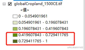 数据下载完毕后,将影像进行加载到arcgis中,本数据的值的范围为0-1(0代表耕地概率为0,1代表耕地概率为100%,值越大,耕地概率越大)。