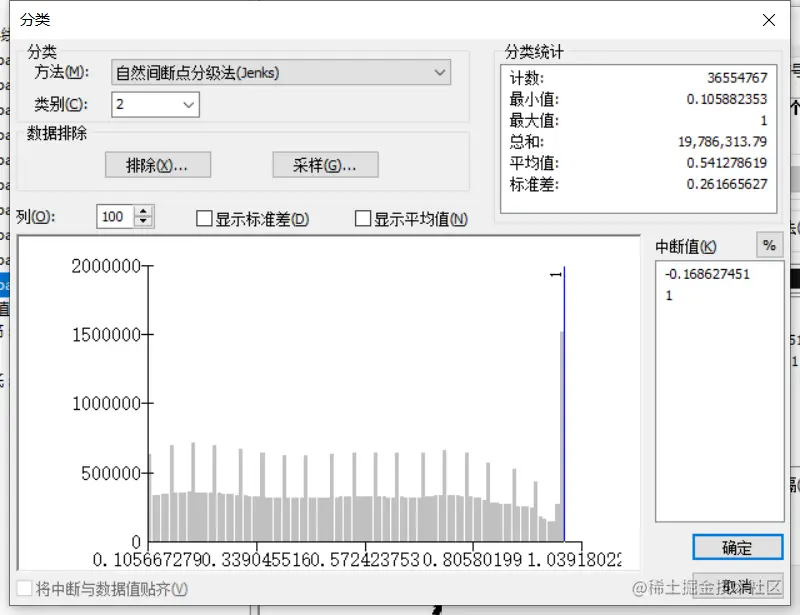 观察到arcgis自动的分类区间值的范围在低水平太密集了,