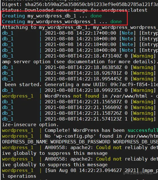 - 安装了 2 个服务,一个是 db mysql,一个是 wordpress 服务