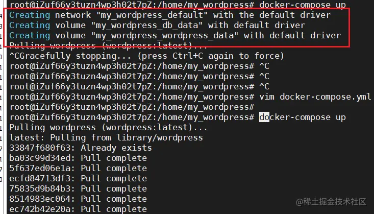 启动之后我们可以看到程序先去创建网络,创建对应的挂载卷